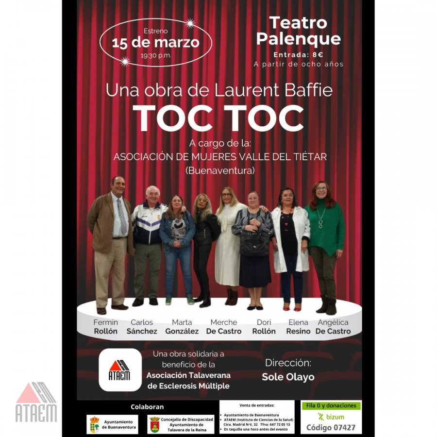 La Asociación de Mujeres Valle del Tiétar de Buenaventura representa la conocida y divertida obra de teatro “Toc Toc”, bajo la dirección de Sole Olayo. Esta representación se realiza con carácter solidario, destinándose la recaudación obtenida de manera íntegra a ATAEM, con el objetivo de apoyar la labor que la entidad desarrolla con personas con enfermedades neurológicas y neurodegenerativas.